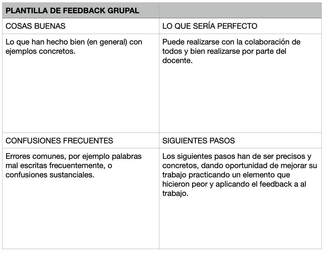 El libro nos ofrece un modelo de una tabla de dos columnas y dos filas, simple, con 4 secciones: una que subraya las cosas buenas; otra que se enfoca a las confusiones más frecuentes incluyendo la escritura; una tercera que incluye un ejemplo; y una final que enlaza con tareas de mejora específicas.