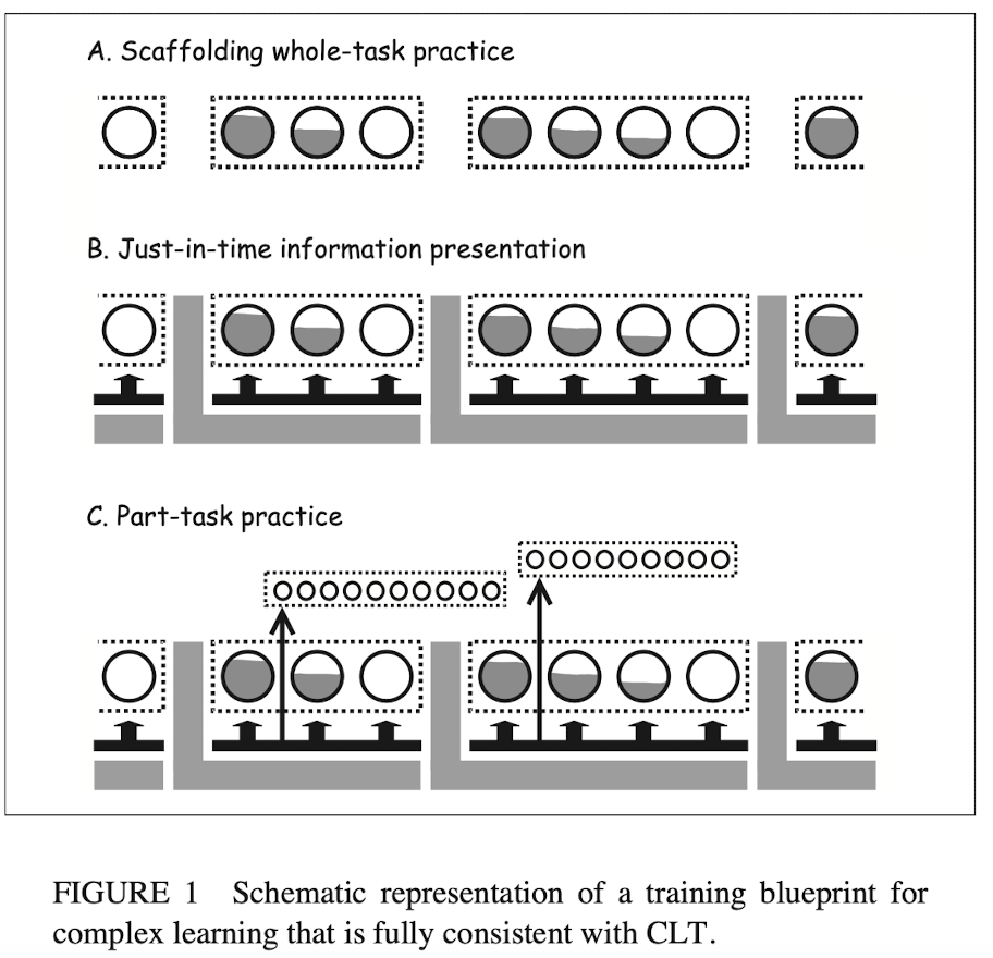 En la figura 1 aparatado A, las tareas de aprendizaje se representan en forma de círculos y se organizan en una secuencia ordenada de clases de tareas (líneas de puntos) que representan versiones simples a complejas de la tarea completa. Estas tareas de aprendizaje suelen ser realizadas por los alumnos en un entorno de tareas simulado o real e, idealmente, les enfrentan a todas las habilidades constitutivas que conforman la habilidad compleja completa. Además, y como se indica en las áreas sombreadas de los círculos, cada clase de tarea comienza con una o más tareas de aprendizaje con un alto nivel de apoyo (por ejemplo, ejemplos resueltos), continúa con tareas de aprendizaje con un nivel de apoyo más bajo (por ejemplo, tareas de finalización, sin objetivos o inversas) y termina con tareas convencionales sin apoyo. Esto se repite para cada clase de tarea subsiguiente, dando lugar a un patrón de apoyo en forma de diente de sierra a lo largo de todo la secuencia didáctica.